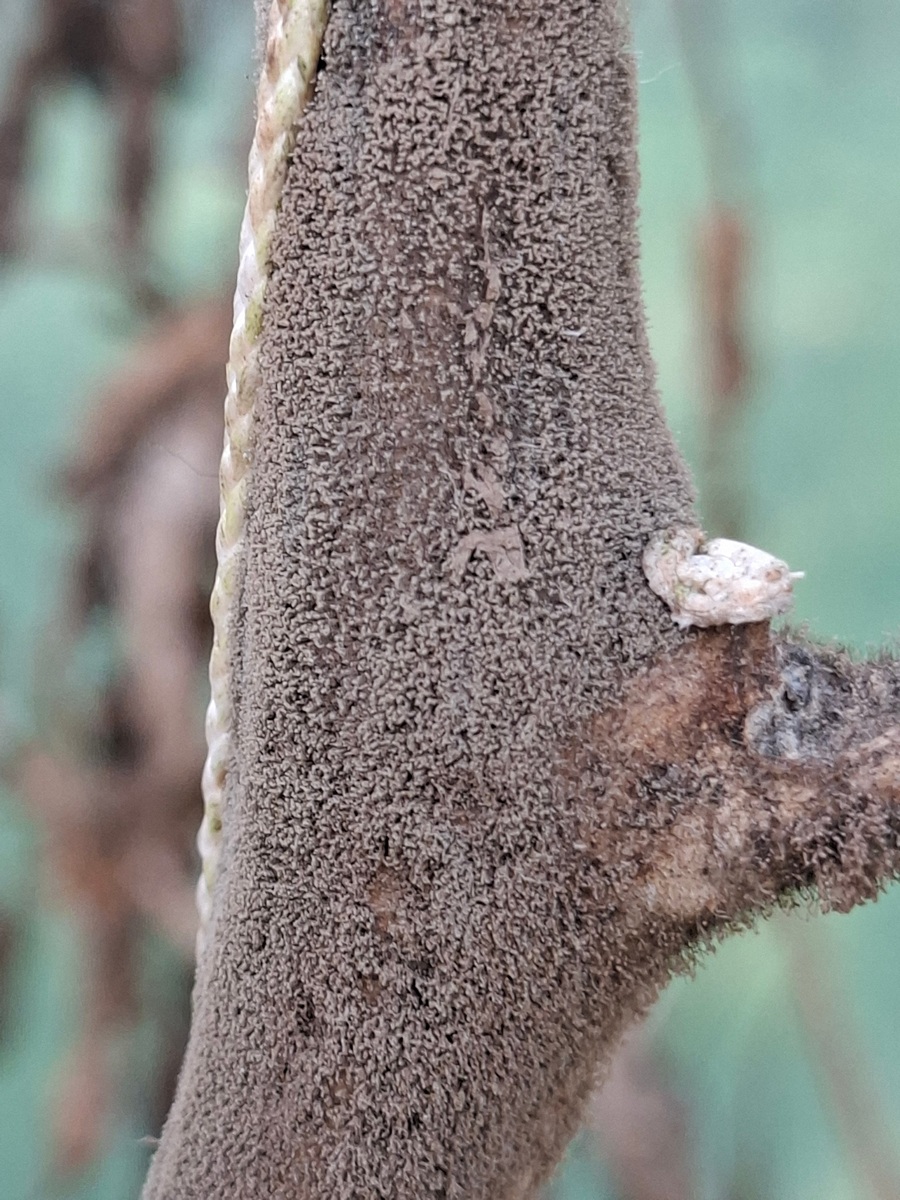 Alguses on näha lehtedel, vartel ja viljadel (sageli viljavarre kinnituskohal) vesiseid pruunikaid laike. Need kattuvad hiljem iseloomuliku kergesti lenduva halli kirmega. Viljadel võib areneda ka pehme mädanik, mille puhul viljakest jääb terveks, sisemus on aga pudrutaoline ja vesine. Viljal on valkjad rõngad, mille keskel väike tumepruun täpp.
